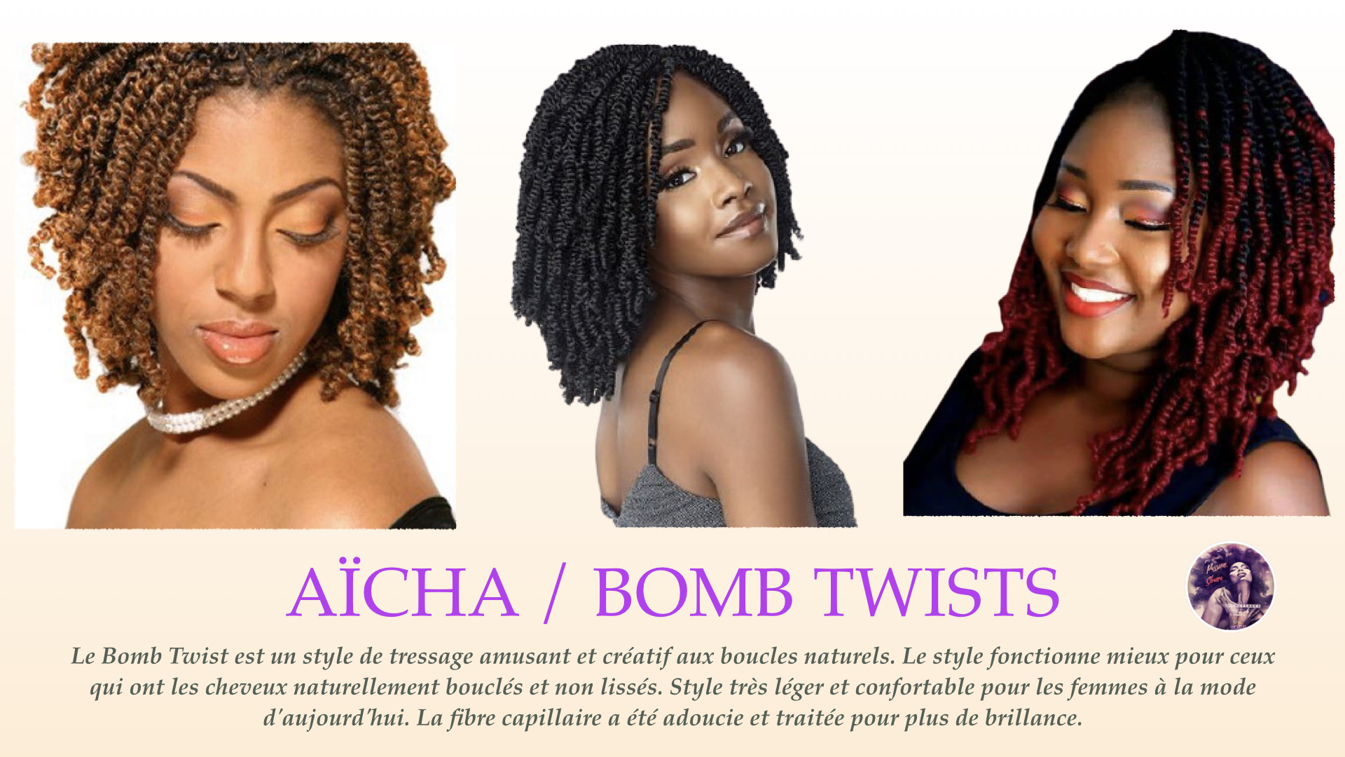 Aicha Bomb Twists est un style de tressage amusant et créatif aux boucles naturelles. Le style fonctionne mieux pour ceux qui ont les cheveux naturellement bouclés et non lissés. Style très léger et confortable pour les femmes a la mode d’aujourd’hui. La fibre capillaire a été adoucie et traitée pour plus de brillance.